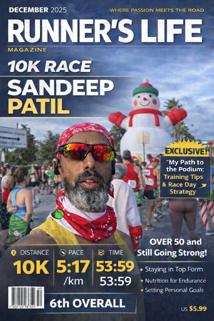 Sandeep Patil delivered an outstanding performance at a recent 10K race, claiming 1st place in the Men’s 50–59 age division and finishing an impressive 6th overall in a competitive field.